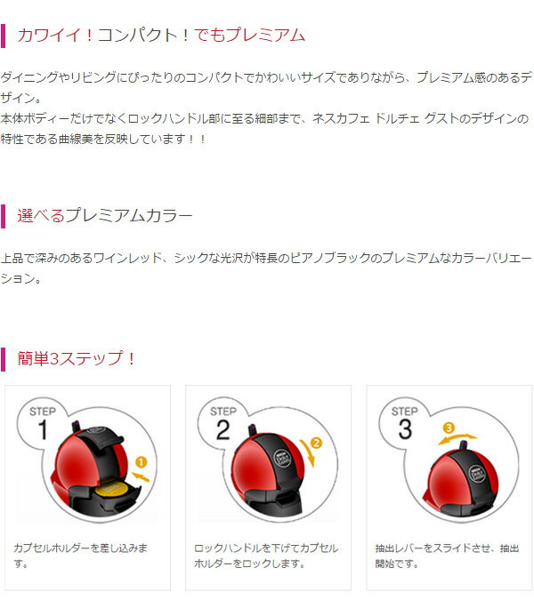 本体ボディーだけでなくロックハンドル部に至る細部まで、ネスカフェ ドルチェ グストのデザインの特性である曲線美を反映しています!!■選べるプレミアムカラー上品で深みのあるワインレッド、シックな光沢が特長のピアノブラックのプレミアムなカラーバリエーション。